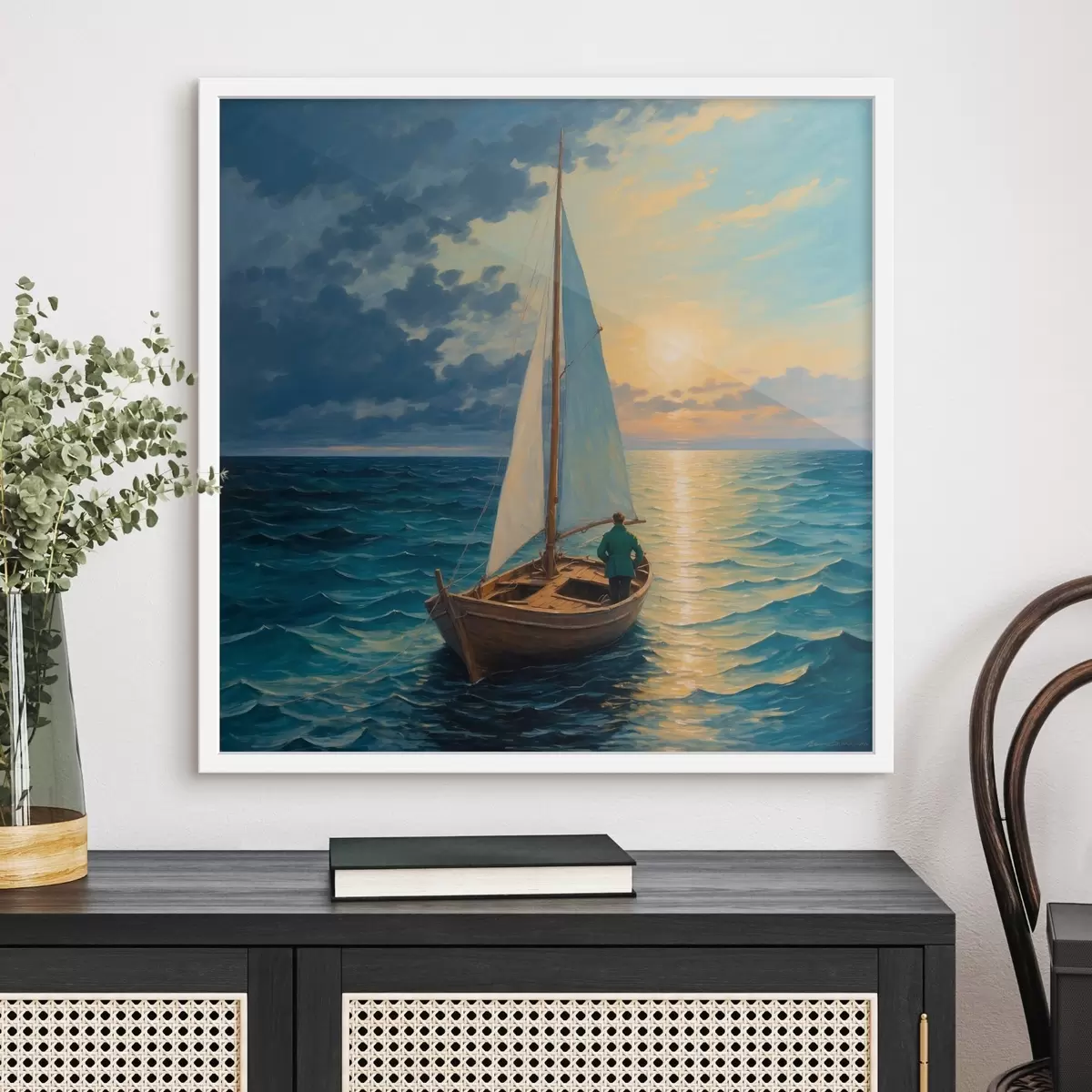 Poster Een man drijft in een boot op zee N° f40053
