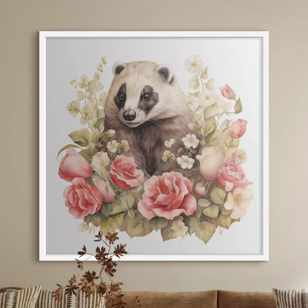 Poster Dassenportret in roze waterverf met vintage rozen N° f40094