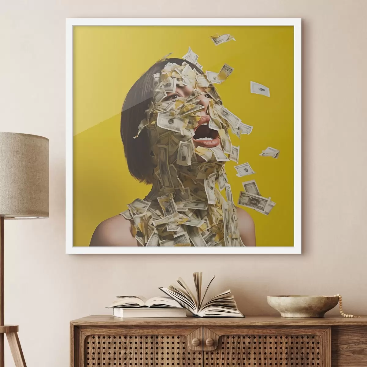 Poster Het gezicht van het meisje is bedekt met papieren rekeningen, geld, gele achtergrond N° f40099