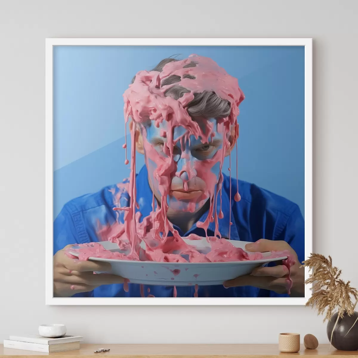 Poster Een man op een blauwe achtergrond in een blauw shirt bedekt met roze verf N° f40102