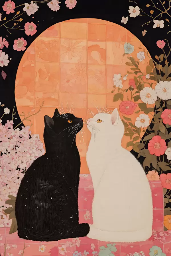 Poster Zwarte en witte kat kijken lief naar elkaar bij zonsondergang N° f40669