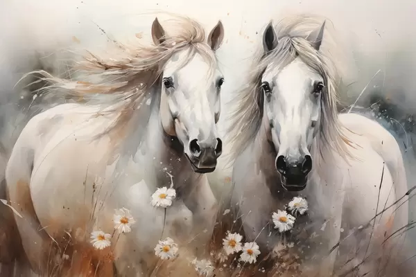 Poster Een paar witte en grijze paarden bij madeliefjes N° f40749