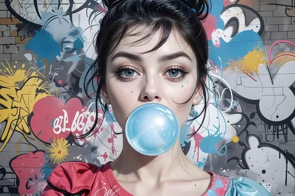 Poster Een vrouw blaast een grote blauwe kauwgombel tegen een kleurrijke graffiti achtergrond N° f41719
