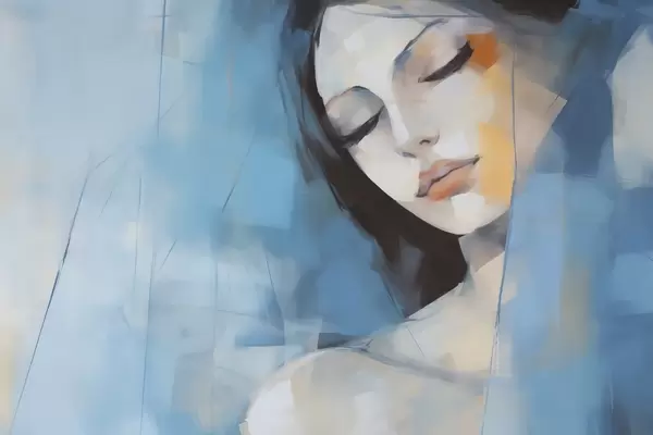 Poster Meisje op abstracte blauwe achtergrond imitatie van schilderij N° f41855