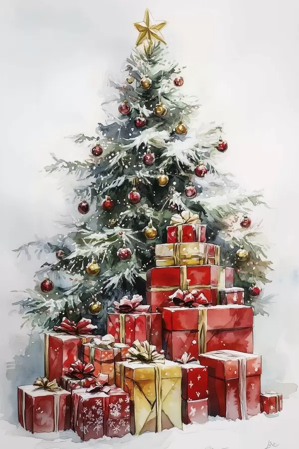 Poster Feestelijke kerstboom met ingepakte cadeautjes, sneeuw, aquarel stijl N° f41953