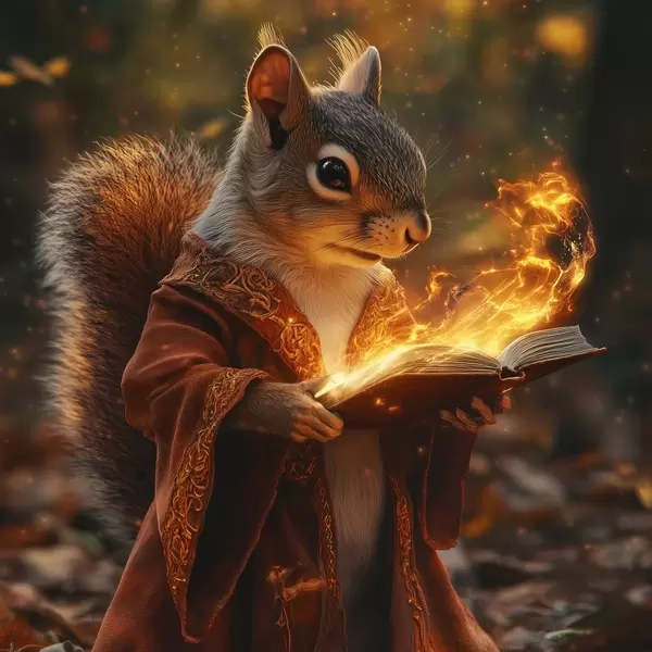 Poster Een mystieke magische eekhoorn in een tovenaarskleed met een magisch boekdeel in zijn handen N° f41983