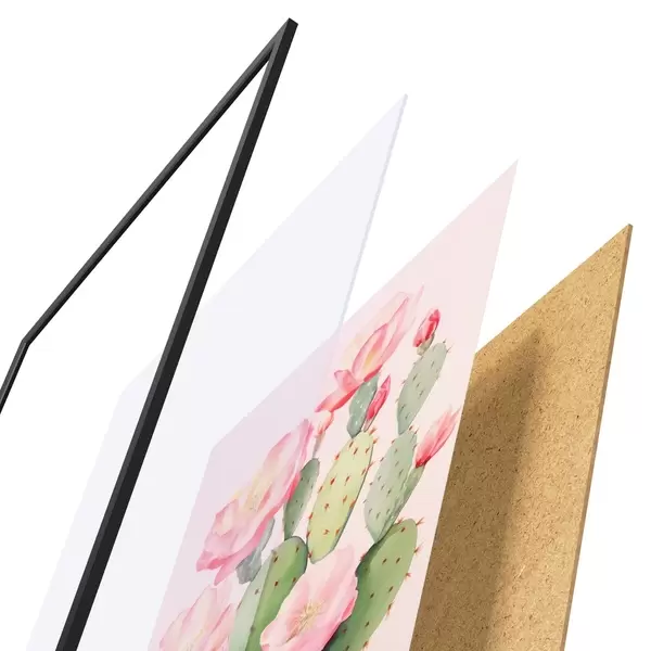 De poster bestaat uit een frame, plexiglas, geprinte afbeelding en spaanplaat achterkant. De poster kan meteen aan de muur worden gehangen dankzij de bevestigingen op de achterkant.