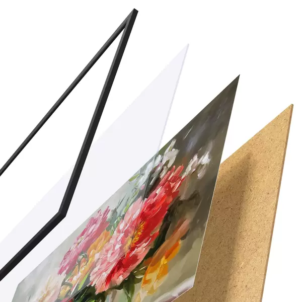De poster bestaat uit een frame, plexiglas, geprinte afbeelding en spaanplaat achterkant. De poster kan meteen aan de muur worden gehangen dankzij de bevestigingen op de achterkant.
