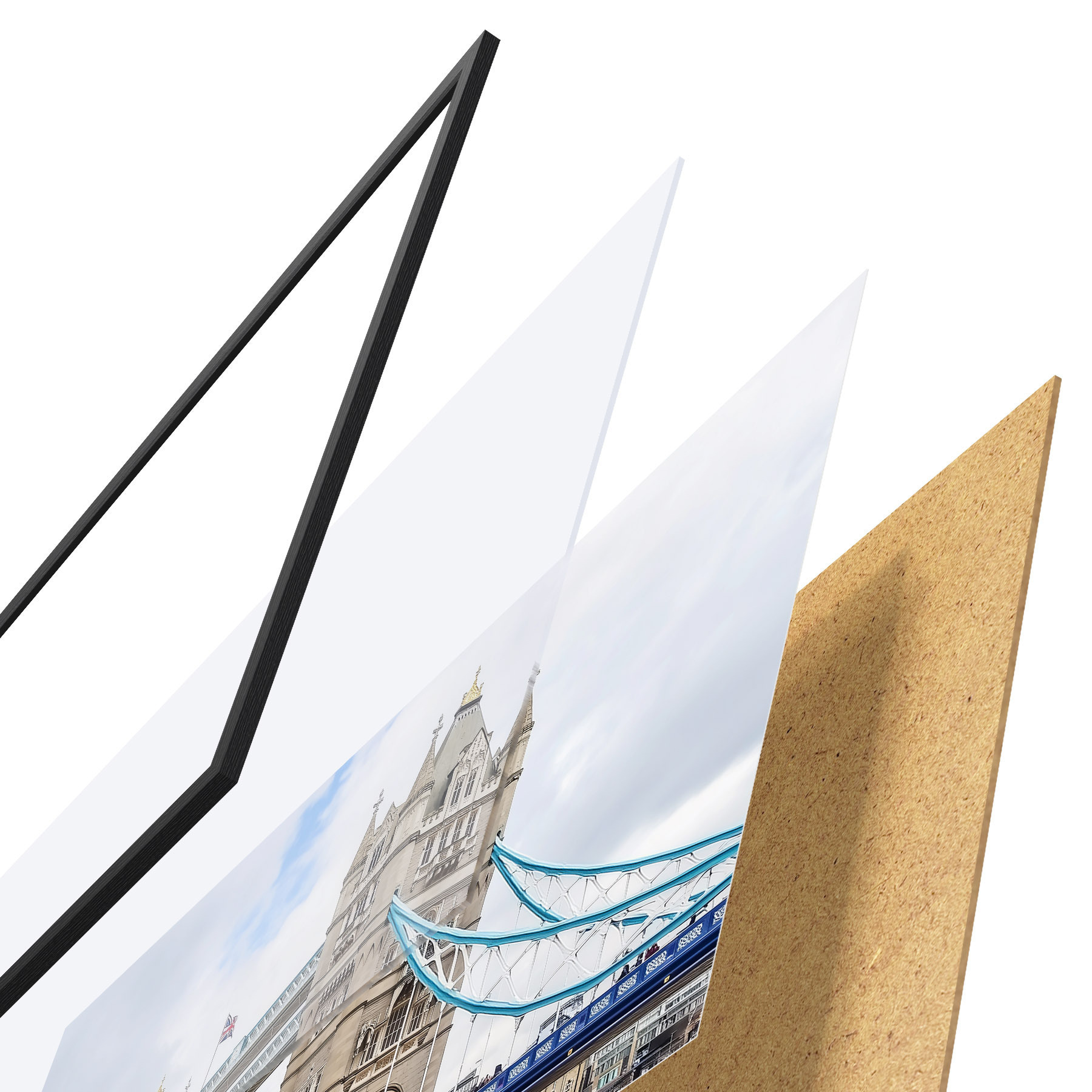 De poster bestaat uit een frame, plexiglas, geprinte afbeelding en spaanplaat achterkant. De poster kan meteen aan de muur worden gehangen dankzij de bevestigingen op de achterkant.