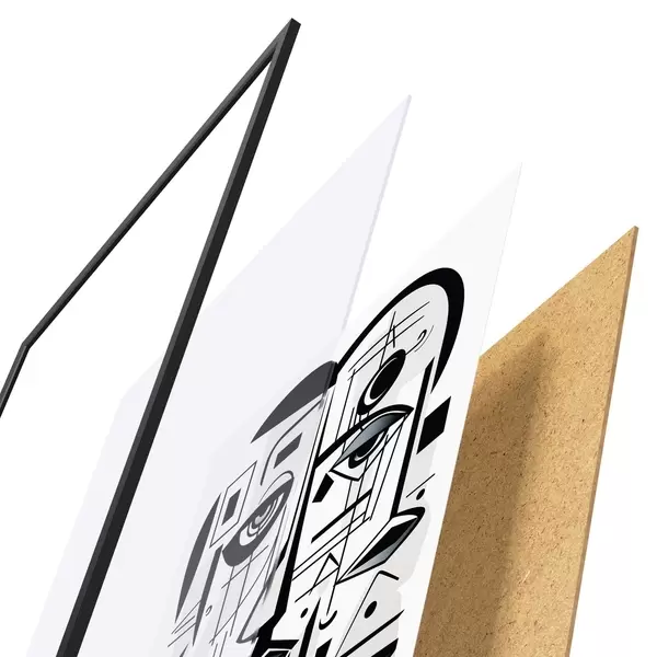 De poster bestaat uit een frame, plexiglas, geprinte afbeelding en spaanplaat achterkant. De poster kan meteen aan de muur worden gehangen dankzij de bevestigingen op de achterkant.