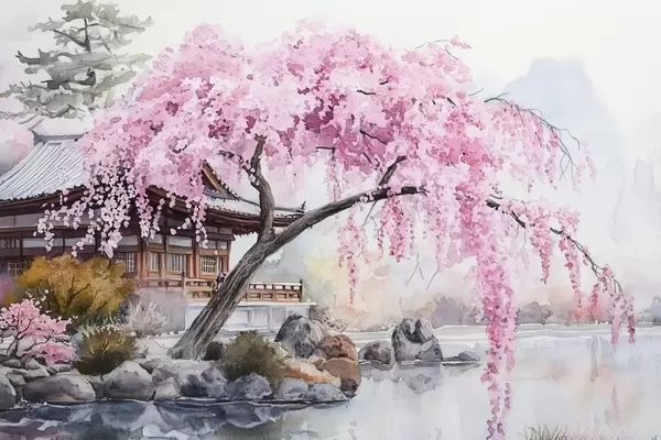Poster Roze kersenboom bij huis aan het meer, Japan, oosters, aquarelstijl N° f44312