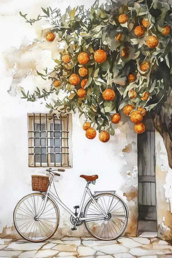 Poster Mediterraan wit huis met sinaasappelboom en fiets N° f44610