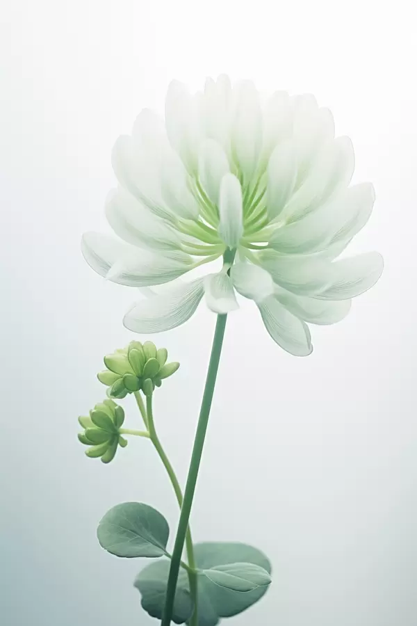 Poster Witte klaver bloem met groene stengel en bladeren, zachte verlichting, schone achtergrond, minimalistische compositie, botanisch N° f45171
