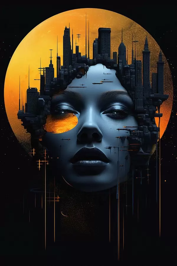 Poster Mensen, meisjesgezicht op een stadsachtergrond, abstract f45341