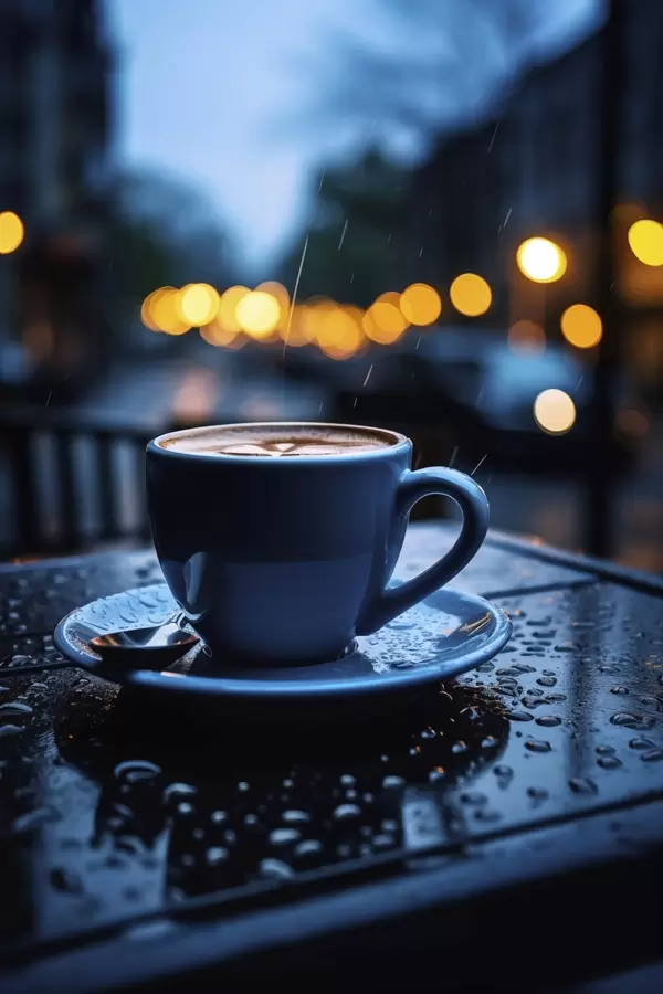 Poster Een kopje koffie op tafel in de regen N° f45497