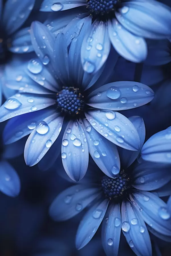 Poster Blauwe bloem met waterdruppels op de bloemblaadjes N° f45499