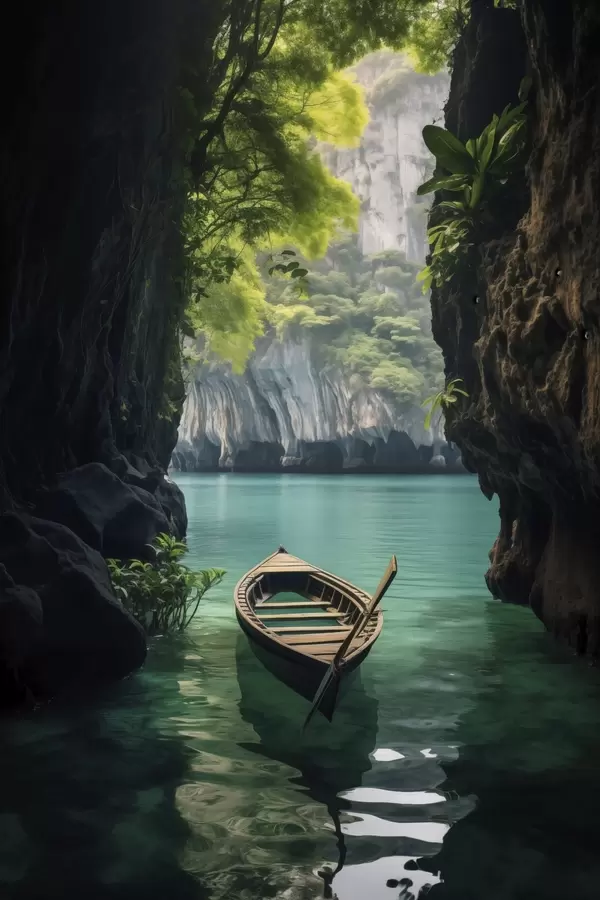 Poster Boot op turquoise water tussen de rotsen N° f45507