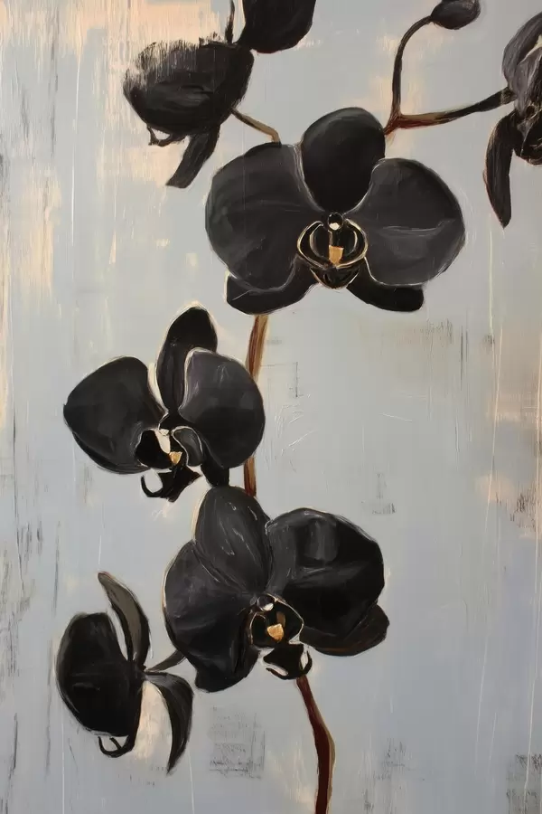 Poster Decoratieve orchideeën: zwarte bloemen op een grijze achtergrond N° f45547