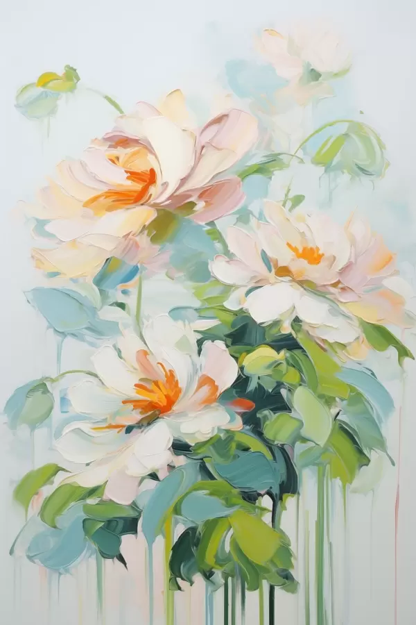Poster Witte en pastel perzik bloemen, groene bladeren, zachte penseelstreken olieverf imitatie, lichtblauwe achtergrond N° f45550