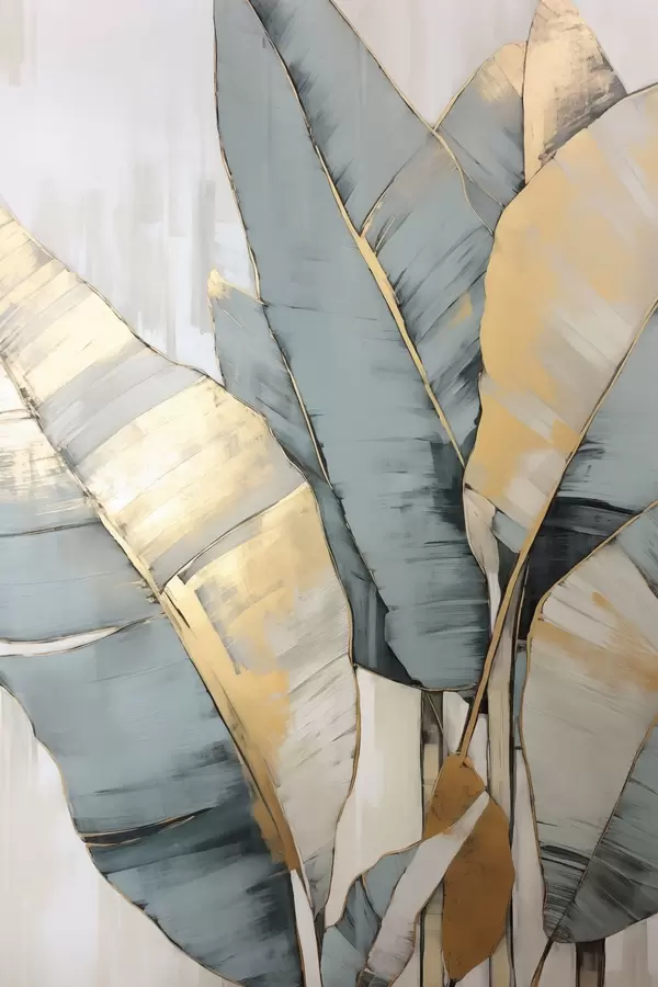 Poster Gedempte blauwe, grijze en gele bananenbladeren met zichtbare penseelstreken, op een witte abstracte achtergrond N° f45552