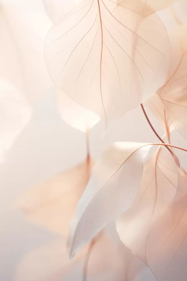 Poster Close-up van doorschijnende bladeren met fijne nerven, zacht perzik en wit kleurenpalet, onscherpe achtergrond N° f45556