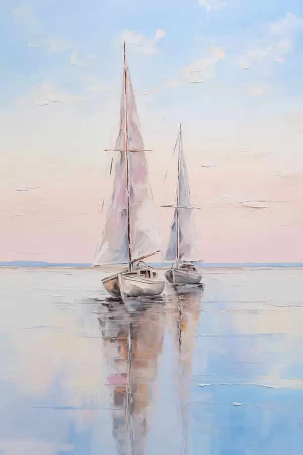 Poster Zeilboten met roze zeilen drijvend op een kalme zee, reflecties van de boten in het water, zachte pastelkleuren N° f45558