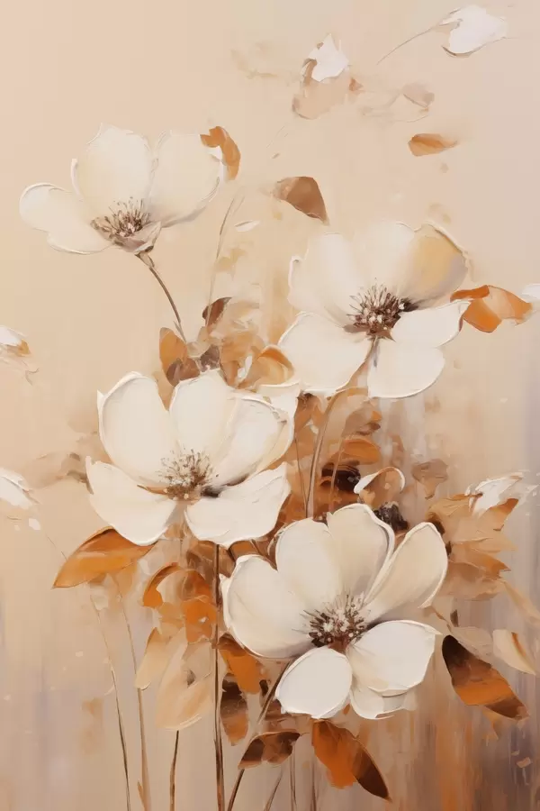 Poster Witte bloemen met oranje bladeren, fijne penseelstreken, warm kleurenpalet, elegante compositie N° f45573