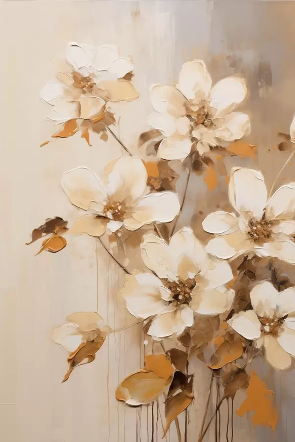Poster Witte bloemen met oranje bladeren, fijne penseelstreken, bloemstuk, botanische kunst N° f45574