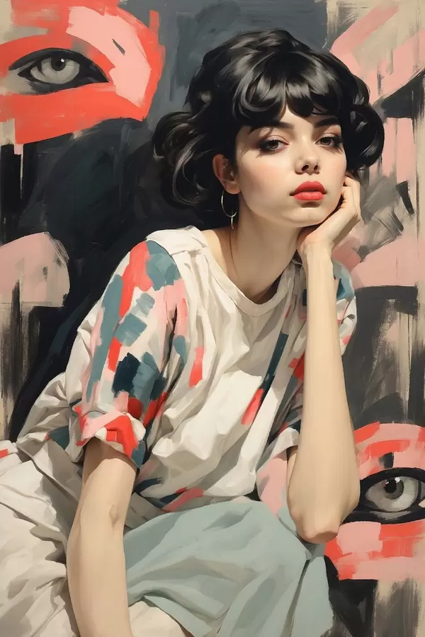 Poster Portret van een meisje tegen een achtergrond met ogen en abstracte streken N° f45623