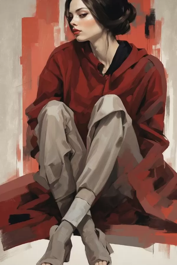 Poster Meisje in een rode mantel zittend met gevouwen benen N° f45624