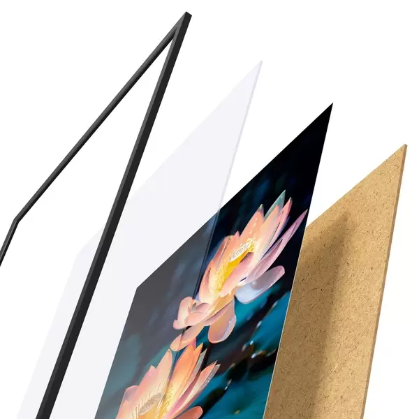 De poster bestaat uit een frame, plexiglas, geprinte afbeelding en spaanplaat achterkant. De poster kan meteen aan de muur worden gehangen dankzij de bevestigingen op de achterkant.