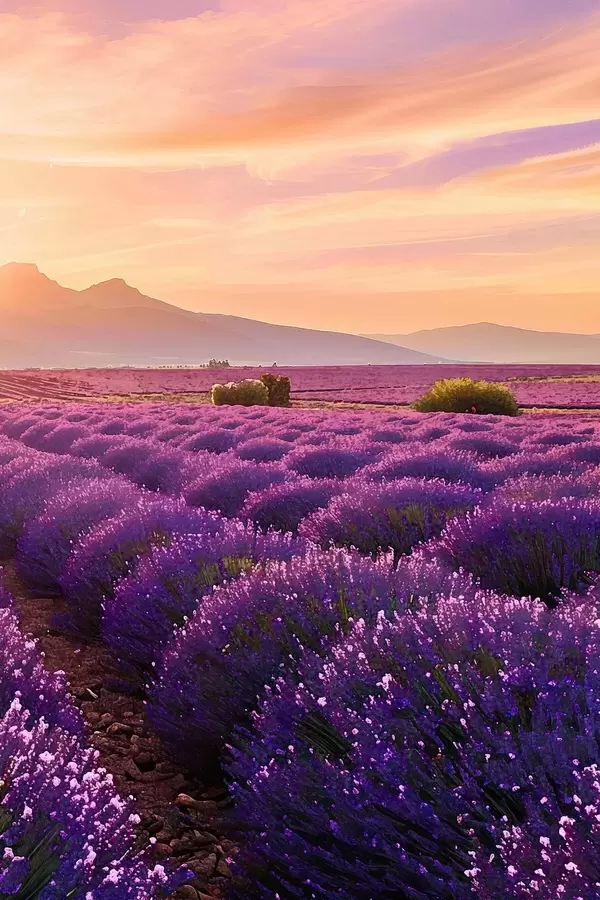 Poster Lavendel tegen de achtergrond van een zonsondergang in de bergen N° f45664