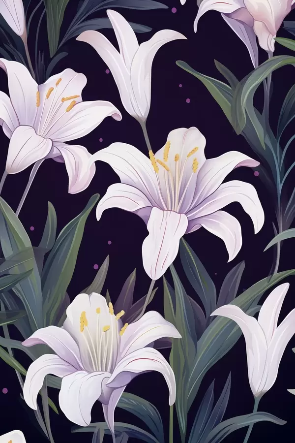 Poster Delicate lelies op een donkere achtergrond met groene bladeren N° f45697