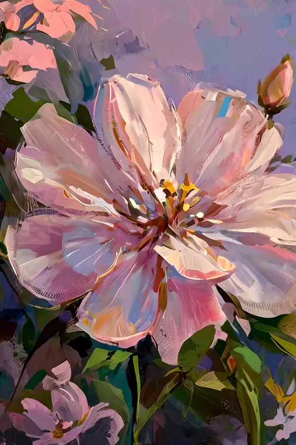 Poster roze bloemen in de stijl van een olieverfschilderij N° f45723