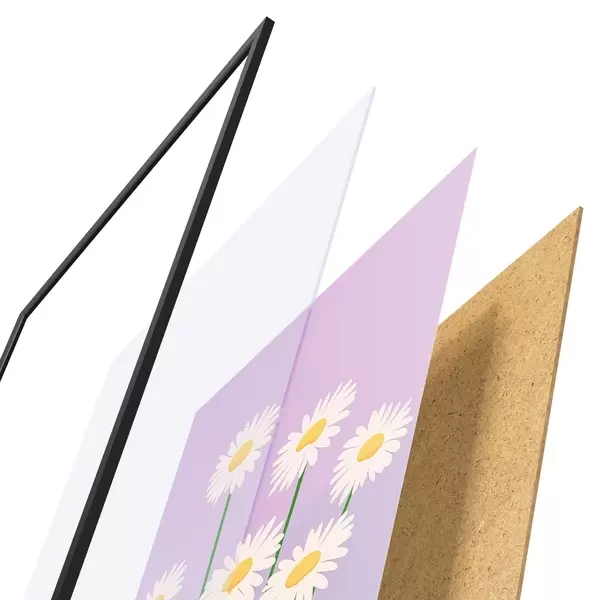 De poster bestaat uit een frame, plexiglas, geprinte afbeelding en spaanplaat achterkant. De poster kan meteen aan de muur worden gehangen dankzij de bevestigingen op de achterkant.