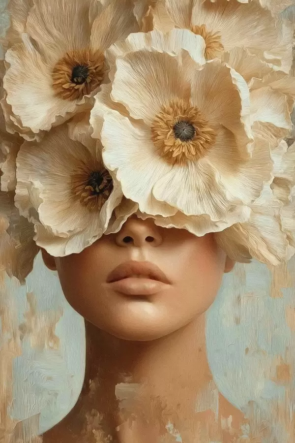 Poster Portret met beige bloemen die de ogen bedekken f45870