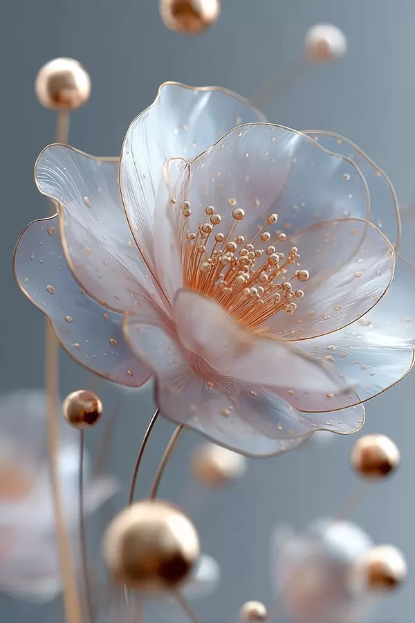 Poster Doorschijnende bloem met koperen meeldraden op blauw N° f45880
