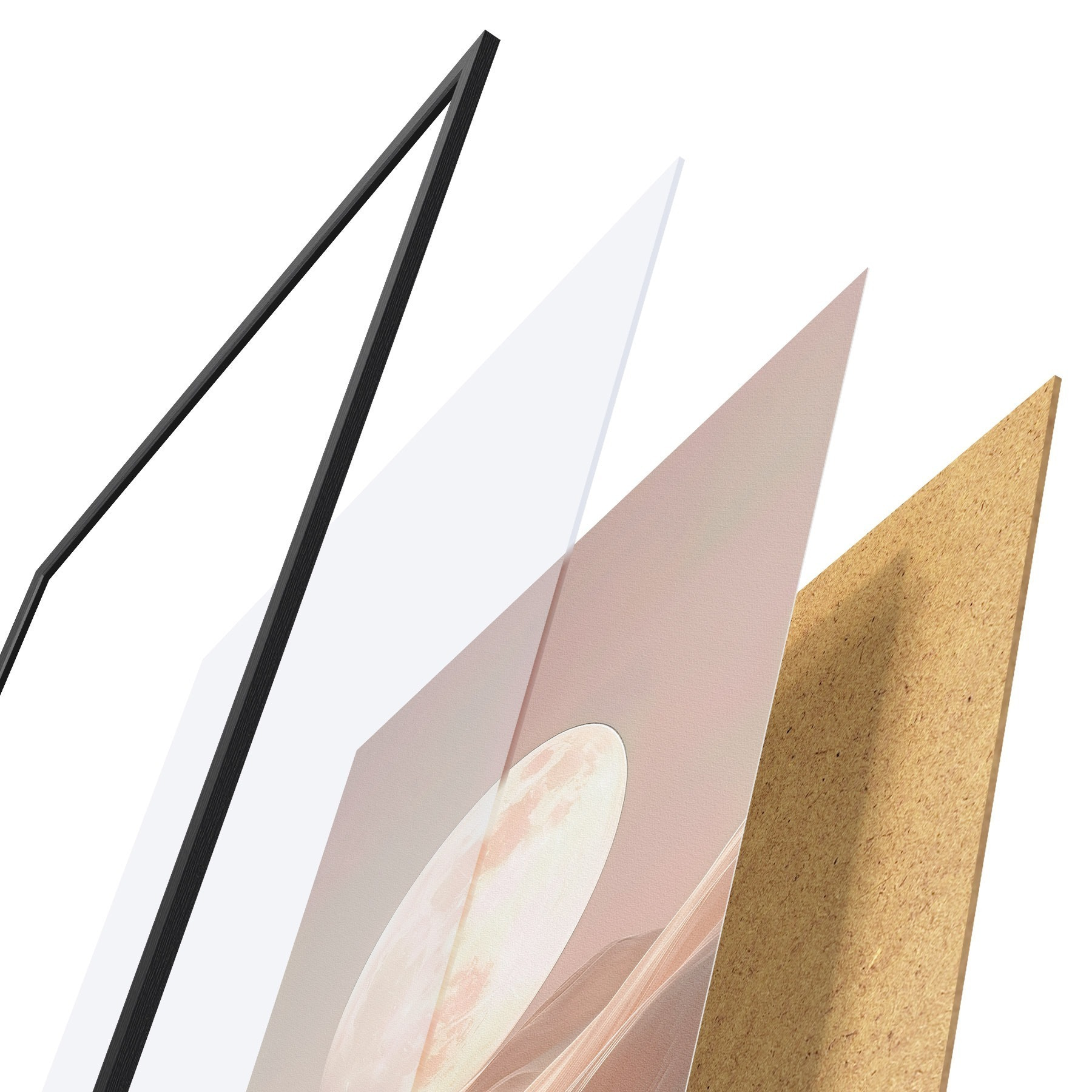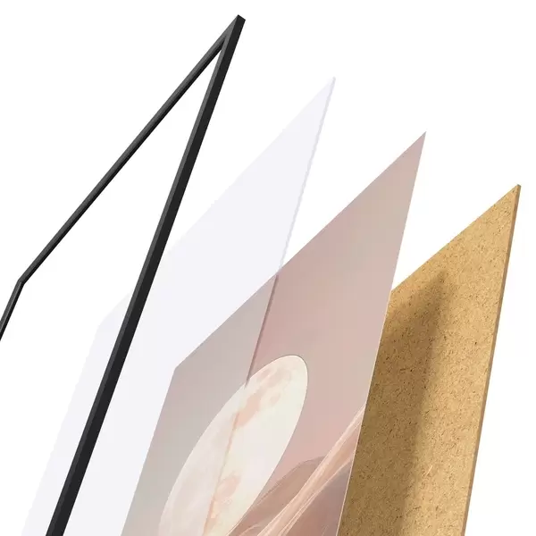 De poster bestaat uit een frame, plexiglas, geprinte afbeelding en spaanplaat achterkant. De poster kan meteen aan de muur worden gehangen dankzij de bevestigingen op de achterkant.