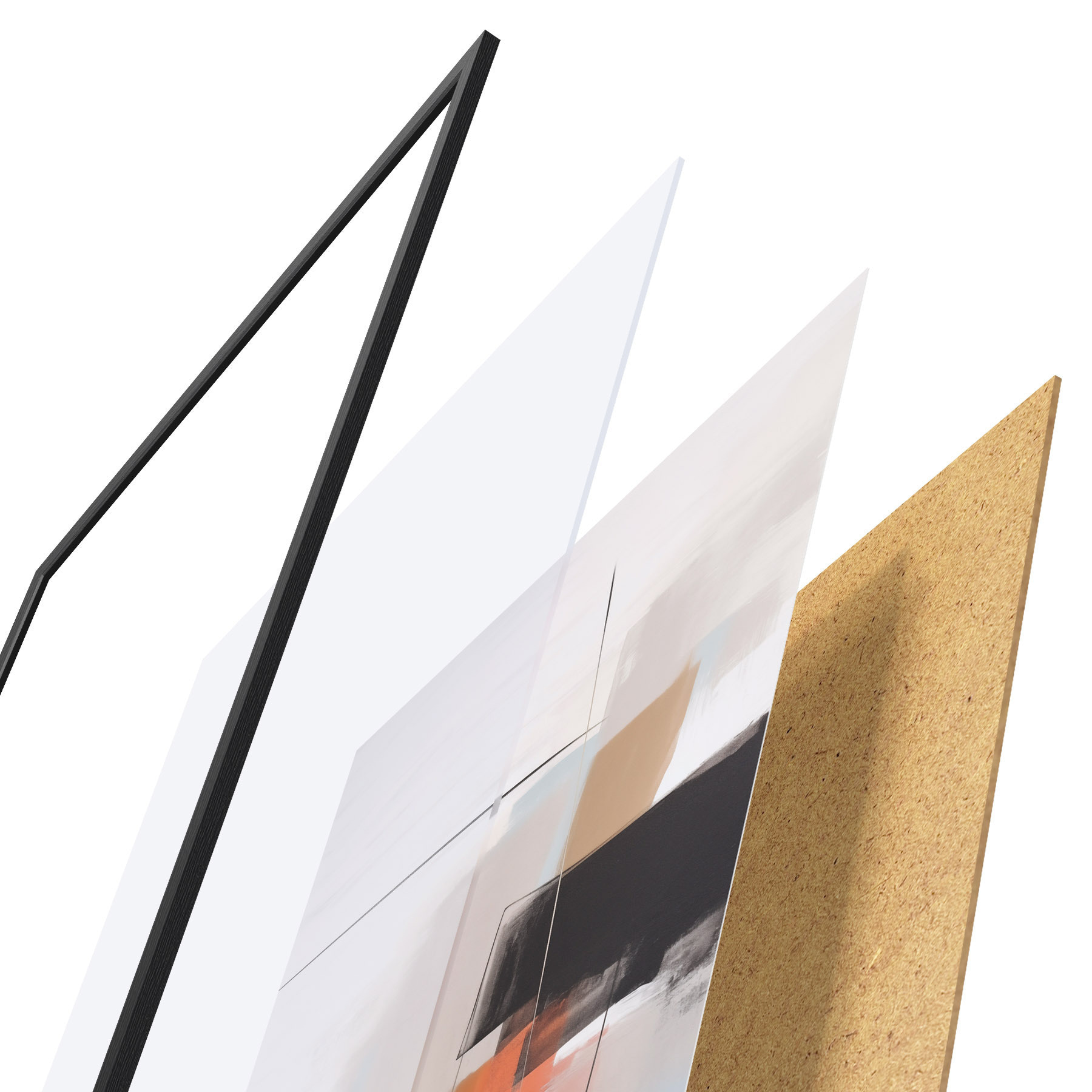 De poster bestaat uit een frame, plexiglas, geprinte afbeelding en spaanplaat achterkant. De poster kan meteen aan de muur worden gehangen dankzij de bevestigingen op de achterkant.