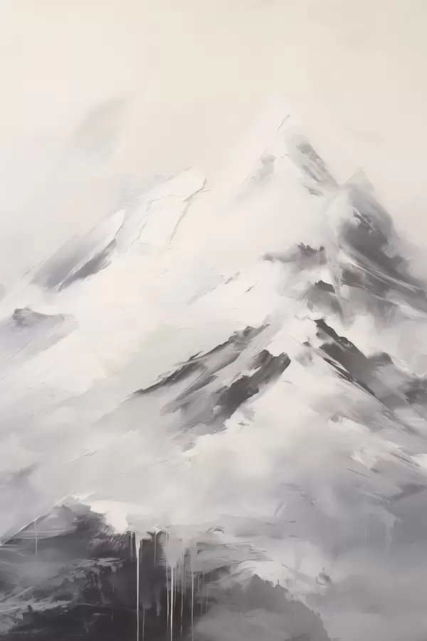 Poster Besneeuwde bergtoppen met grijze schaduwen, grijze lucht, penseelstreken, gestructureerd, minimalistisch N° f45932