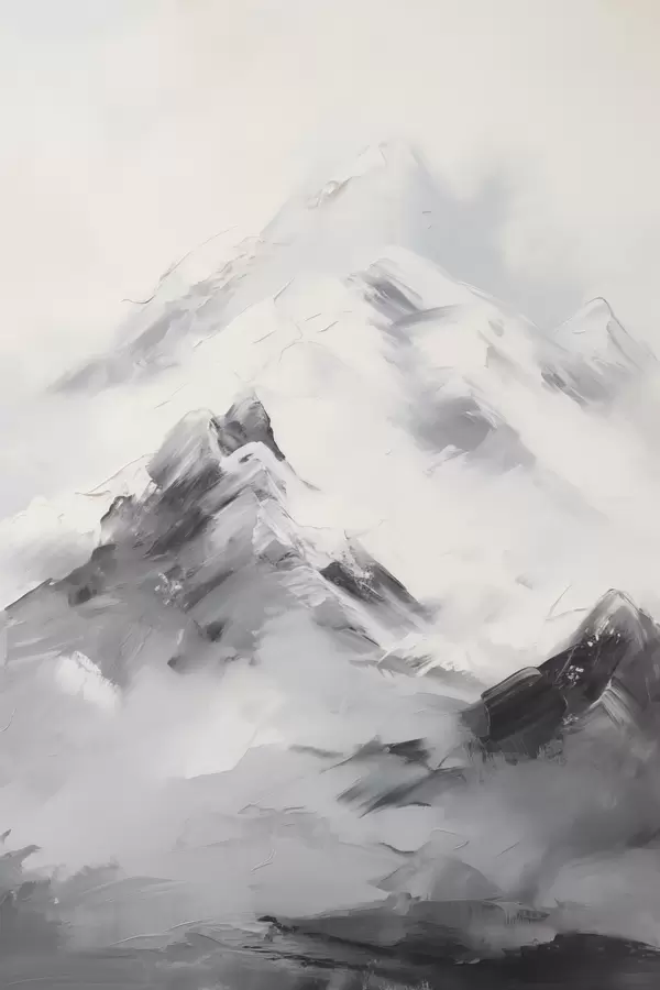 Poster Besneeuwde bergtoppen met grijze schaduwen, grijze lucht, penseelstreken, gestructureerd, minimalistisch N° f45933