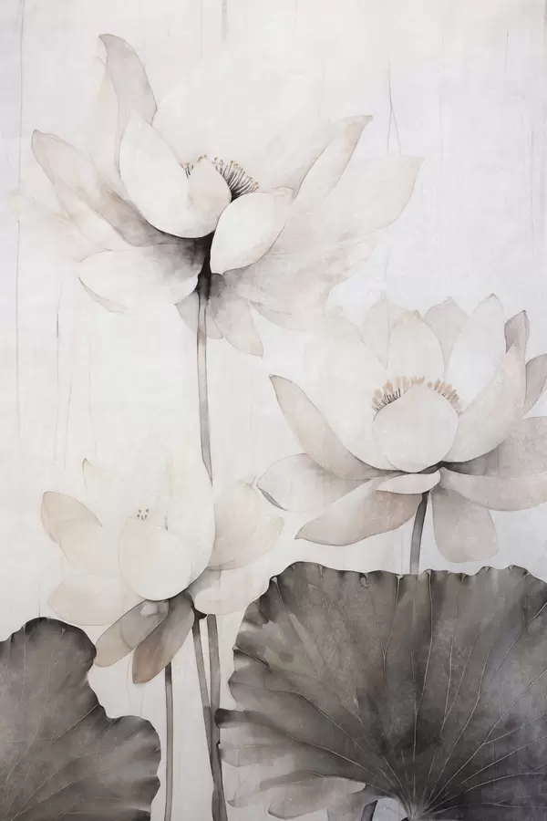 Poster Witte lotusbloemen met textuur en donkere bladeren, lichte achtergrond, minimalistisch ontwerp N° f45936