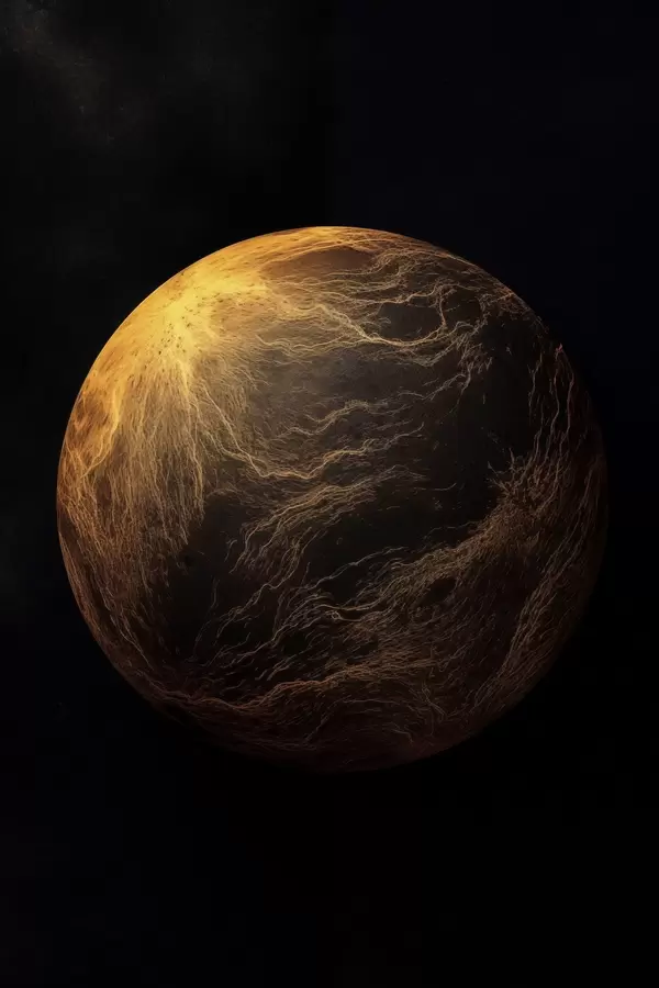 Poster Abstracte planeet met oranje aderen tegen een zwarte ruimteachtergrond, moderne minimalistische kunst N° f45943
