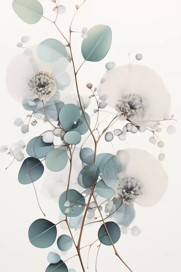 Poster Eucalyptus abstracte bloemen met witte bloemblaadjes, gedempte groene bladeren aan takken N° f45946
