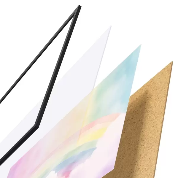 De poster bestaat uit een frame, plexiglas, geprinte afbeelding en spaanplaat achterkant. De poster kan meteen aan de muur worden gehangen dankzij de bevestigingen op de achterkant.