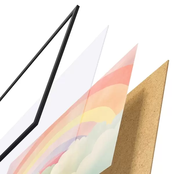 De poster bestaat uit een frame, plexiglas, geprinte afbeelding en spaanplaat achterkant. De poster kan meteen aan de muur worden gehangen dankzij de bevestigingen op de achterkant.