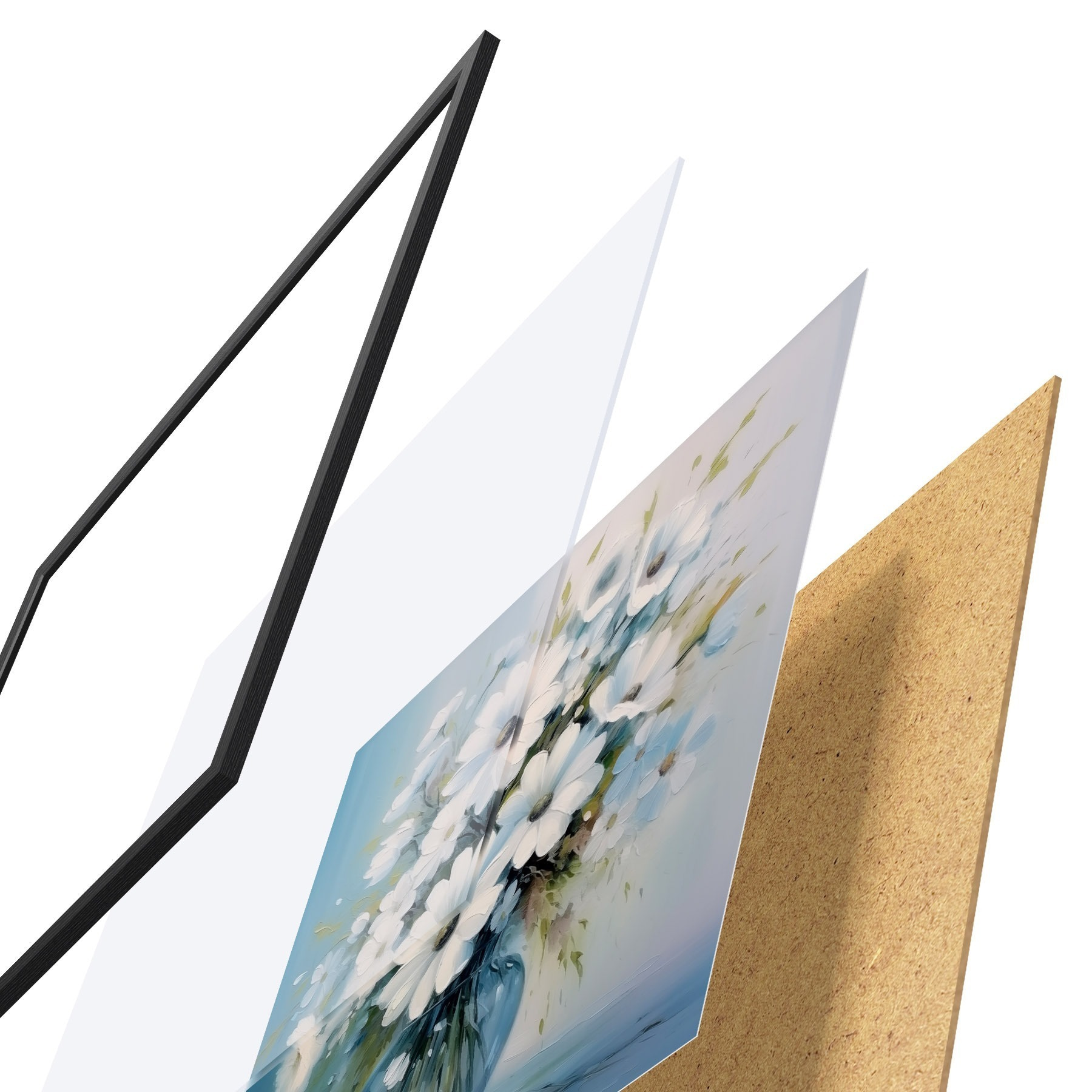 De poster bestaat uit een frame, plexiglas, geprinte afbeelding en spaanplaat achterkant. De poster kan meteen aan de muur worden gehangen dankzij de bevestigingen op de achterkant.