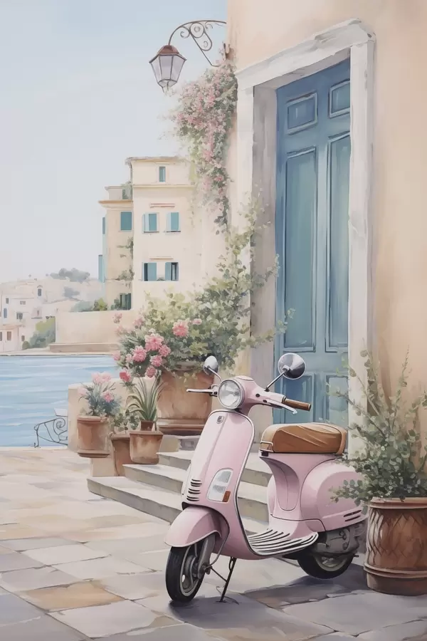 Poster Een scooter tegen de achtergrond van een huis N° f46065