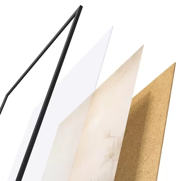 De poster bestaat uit een frame, plexiglas, geprinte afbeelding en spaanplaat achterkant. De poster kan meteen aan de muur worden gehangen dankzij de bevestigingen op de achterkant.