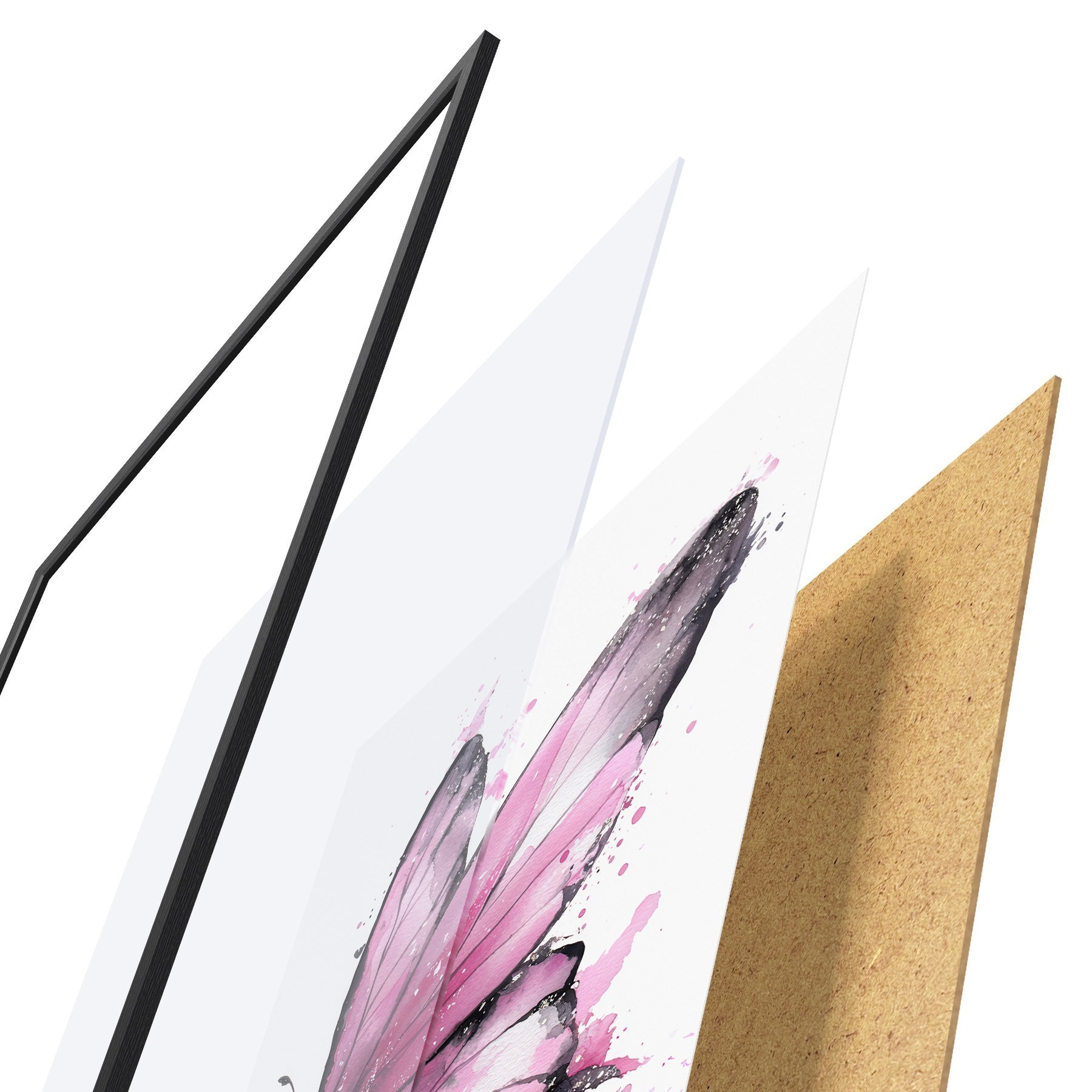 De poster bestaat uit een frame, plexiglas, geprinte afbeelding en spaanplaat achterkant. De poster kan meteen aan de muur worden gehangen dankzij de bevestigingen op de achterkant.